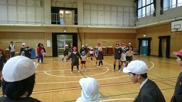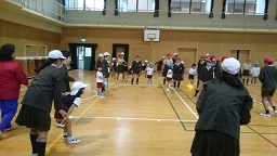 6年1組と小学校の講堂で、「転がしドッジ」をしました。