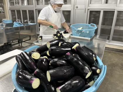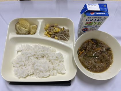 「マーボーなす、ツナと野菜のいためもの、焼きさつまいもの甘みつかけ、ごはん、牛乳」です。
