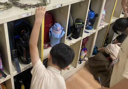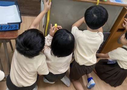 長さや高さ、かさなど、大きさ比べの学習をしています。ロッカーや机など、いろいろなものにテープを当てて、友だちの調べたものと比べながら楽しく学習しました。