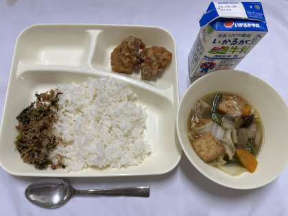 「鶏肉のたつたあげ、あつあげと野菜の煮物、おかか菜っ葉、ごはん、牛乳」です。