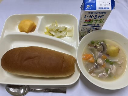 「鶏肉とさつまいものクリームシチュー、白菜のピクルス、かき、黒糖パン、牛乳」です。
