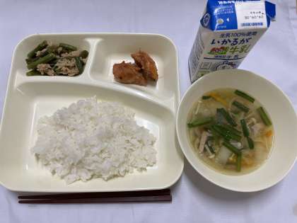 「鶏肉のチリソース焼き、ツナと三度豆のオイスターソースいため、焼き豚のスープ、ごはん、牛乳」です。