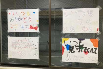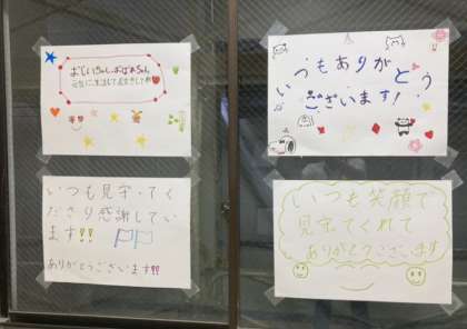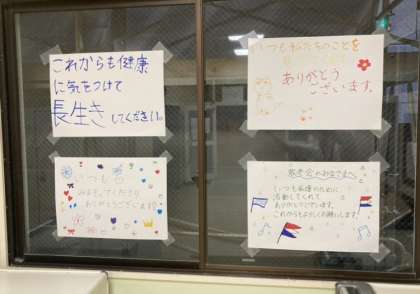 敬愛慰安大会に合わせて、地域のみなさまに日頃の感謝を伝えようと6年生がメッセージを書き、講堂入口に掲示しました。