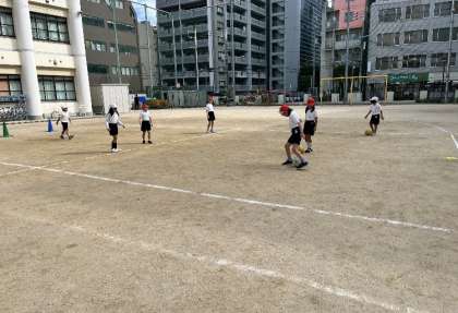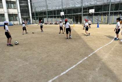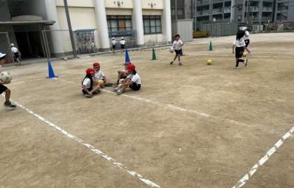 ボールけりの学習をしています。チームで作戦をたてたり、練習をしたりしています。「今のよかったよ」や「ナイス」など励まし合って活動しています。
