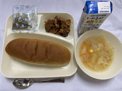 「なすのミートグラタン、鶏肉とキャベツのスープ、ミニフィッシュ、黒糖パン、牛乳」です。