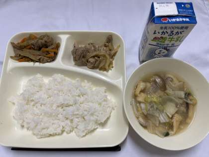 「鶏肉の梅風味焼き、きんぴらごぼう、うすくず汁、ごはん、牛乳」です。