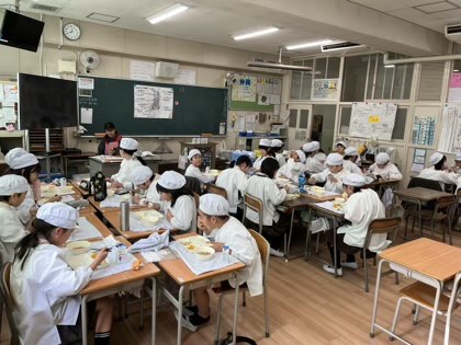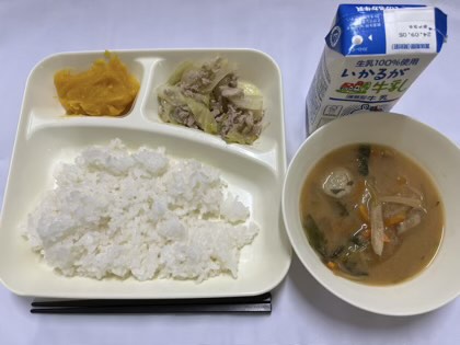 「豚肉と野菜のいためもの、いわしのつみれ汁、かぼちゃういろう、ごはん、牛乳」です。