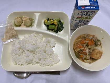 「ジャージャンどうふ、チンゲンサイのオイスターソースあえ、抹茶白玉のきな粉がけ、ごはん、牛乳」です。