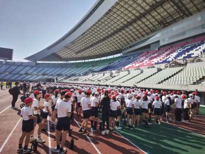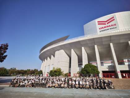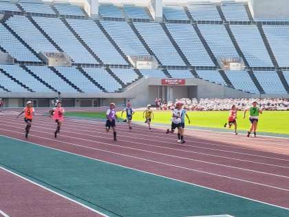 秋晴れのもと、ヤンマーフィールド長居で北区スポーツ交歓会が行われました。普段体験できない場所で思いきりスポーツに親しみます。