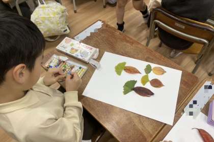 南天満公園まで、落ち葉拾いに行きました。拾った落ち葉を組み合わせて、「何に見えるかな」と想像を膨らませながら画用紙に貼りました。