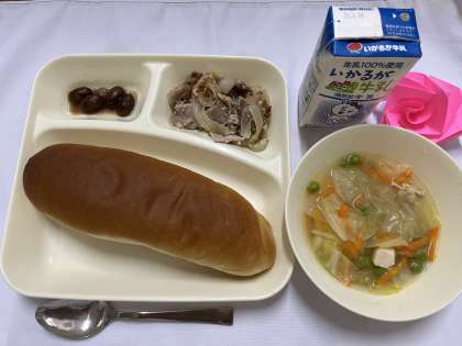 「豚肉のバジル焼き、うずら豆のグラッセ、スープ、黒糖パン、牛乳」です。