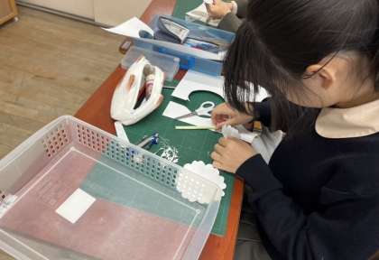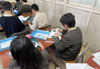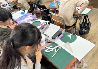 作品展に向けて、カッターやはさみ、分度器などを使って画用紙を切り、立体作品作りに取り組んでいます。どんな作品ができあがるのか楽しみです。