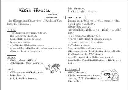 明日から冬休みです。学校では、子どもたちに「冬休みのくらし」を配付して、楽しく安心で安全な過ごし方について指導しています。