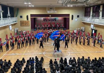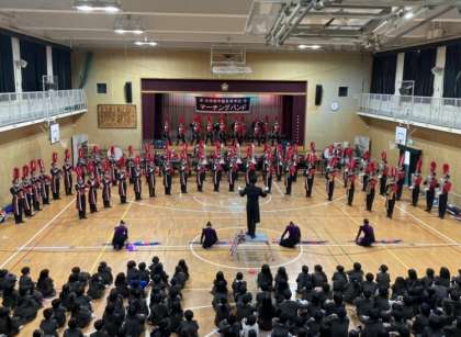 高校のマーチングバンド部に来てもらい、マーチングを披露していただきました。息を合わせた動きや迫力に圧倒され、とても感動しました。マーチングに長年取り組んでいる本校の子どもたちにとって、高校生のマーチングを目の前でみれるとても貴重で有意義な時間になりました。