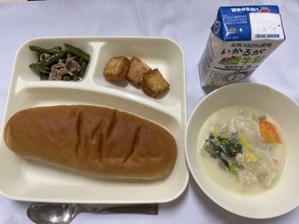 「白菜のクリーム煮、あつあげのピリ辛じょうゆかけ、豚肉と三度豆のオイスターソースいため、黒糖パン、牛乳」です。