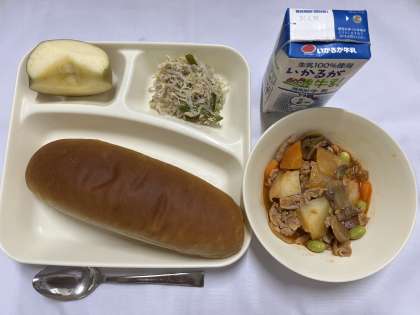 「ケチャップ煮、ささみと野菜のソテー、りんご、黒糖パン、牛乳」です。