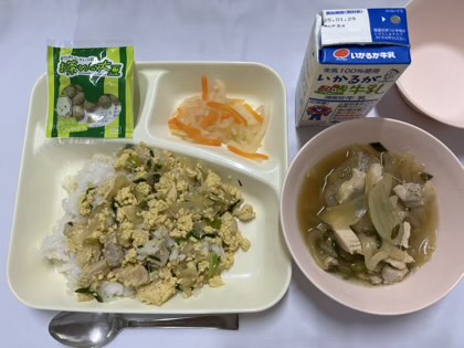 たまごを加える直前に別鍋で加熱し、ピンクの器にとりわけています。