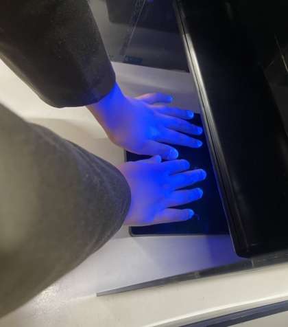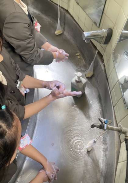 ハクゾウメディカルの方々に、手洗いについての授業をしていただきました。手洗い実験をして、汚れが落ちにくいところを確かめたり、これから手洗いで気をつけたいことを考えたりしました。
