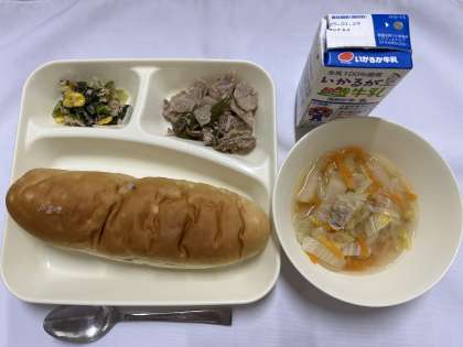 「豚肉のオイスターソース焼き、ツナとチンゲンサイのいためもの、中華スープ、おさつパン、牛乳」です。