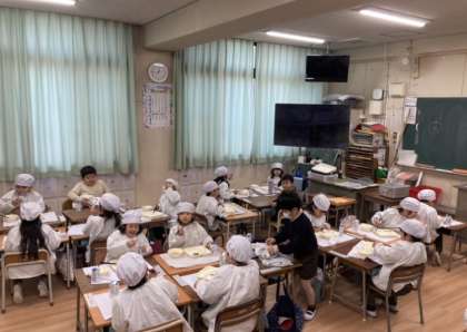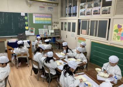 給食は、子どもたちが楽しみにしている時間のひとつです。友だちと会話をしながら楽しく給食を食べています。