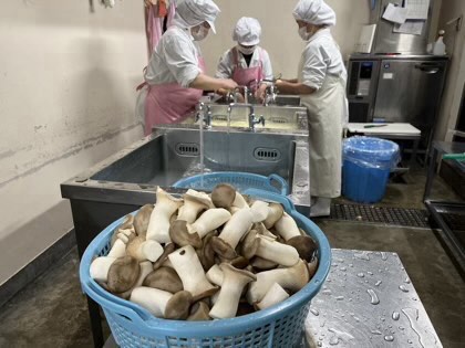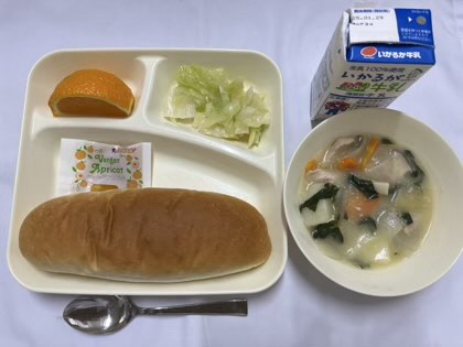 「鶏肉とほうれん草のシチュー、キャベツのサラダ、デコポン、コッペパン、アプリコットジャム、牛乳」です。
