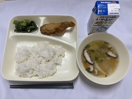 「たらフライ、小松菜のごまあえ、うすくず汁、ごはん、牛乳」です。