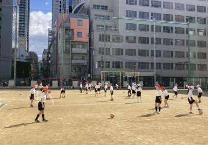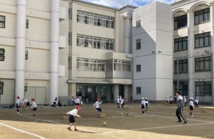 寒い中ですが、子どもたちはとても元気。ボールをけって楽しく体を動かしています。