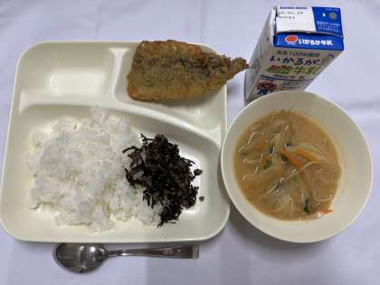 「いわしフライ、牛ひじきそぼろ、みそ汁、ごはん、牛乳」です。
