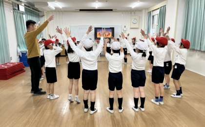 リズム運動の学習をしています。音楽に合わせて楽しく体を動かしています。タタロチカは大盛り上がりです。