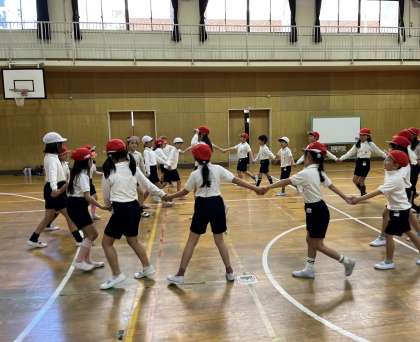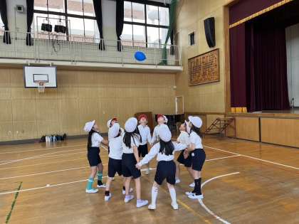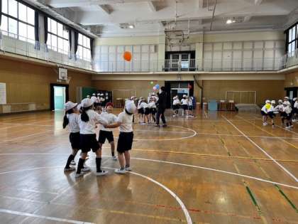 体育の学習では、手を繋いで風船バレーをしました。また、みんなで同じ方向に動いたり回ったりして楽しく活動しました。