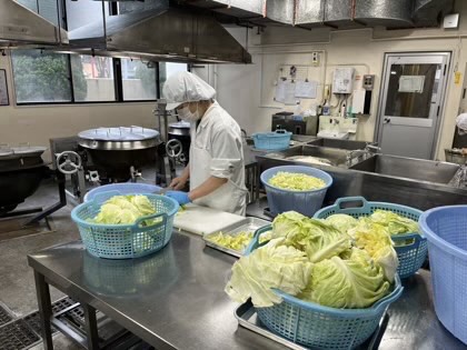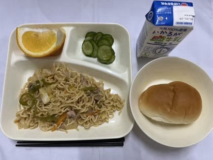 「焼きそば、きゅうりのしょうがづけ、あまなつかん、ミニコッペパン、牛乳」です。