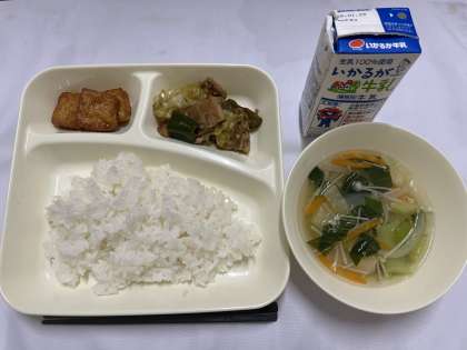 「ホイコウロー、厚揚げのピリ辛じょうゆかけ、中華スープ、ごはん、牛乳」です。