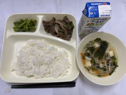 「プルコギ、とうふとわかめのスープ、三度豆のナムル、ごはん、牛乳」です。