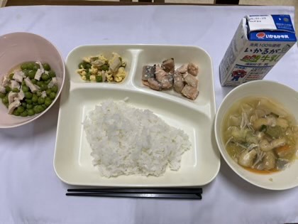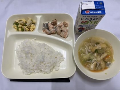 「さけのみそ焼き、えんどうの卵とじ、五目汁、ごはん、牛乳」です。