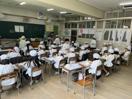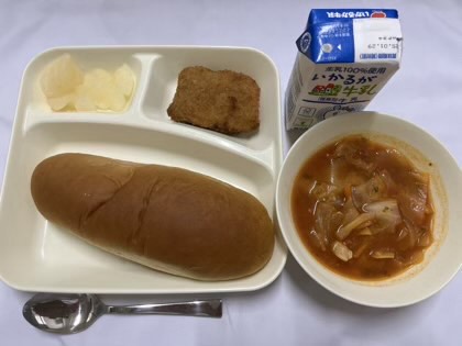 「トンカツ、ミネストローネ、和なし(缶)、黒糖パン、牛乳」です。