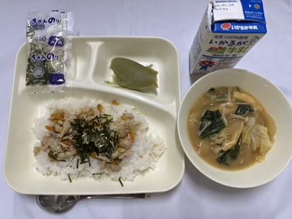 「かやくごはん、みそ汁、まっちゃういろう、牛乳」です。
