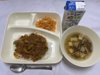 「タコライス、にんじんしりしり風、とうふともずくのとろり汁、ごはん、牛乳」