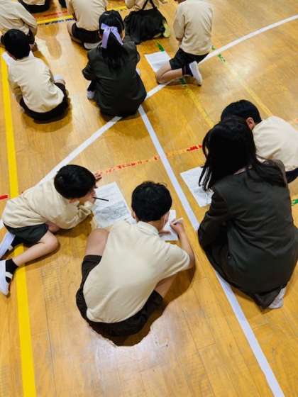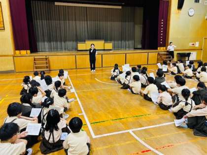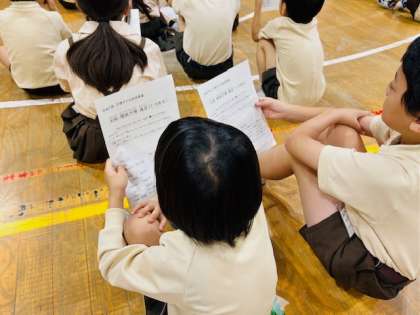 今日は1年生と5年生で一緒にしおりを見て、オリエンテーションをしました。