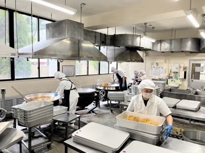 給食室では、大きな釜を3つ使って、スパゲティを作っています。