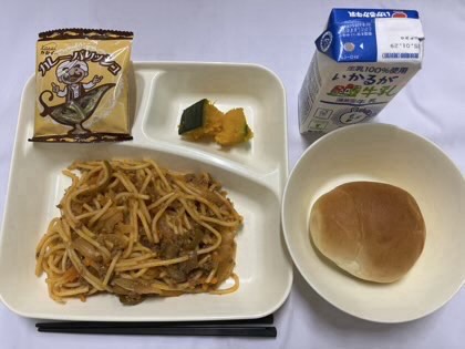 「ミートソーススパゲティ、焼きかぼちゃ、カレーフィッシュ、ミニコッペパン、牛乳」です。