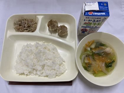「焼きシューマイ、ツナともやしのいためもの、鶏肉とはるさめのスープ、ごはん、牛乳」です。