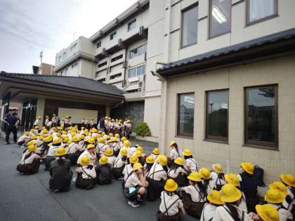 素晴らしい景色と美味しい料理が楽しみです。まずは、避難訓練を行いました。