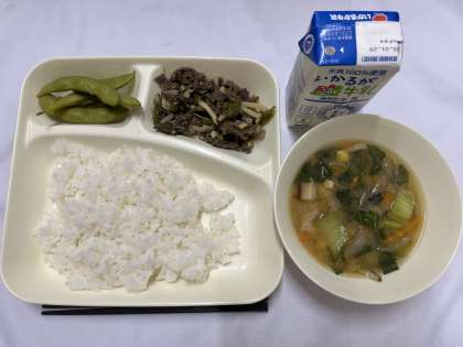 「チンジャオニューロウスー、中華みそスープ、えだまめ、ごはん、牛乳」です。