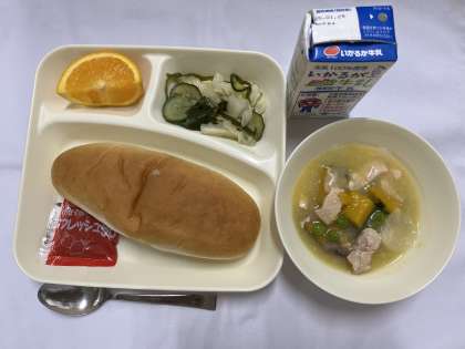 「鶏肉とかぼちゃのシチュー、ミックス海草のサラダ、オレンジ、コッペパン、いちごジャム、牛乳」です。
