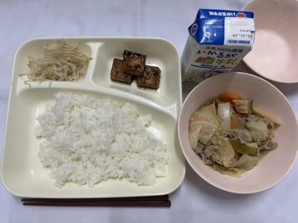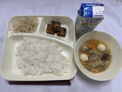 「八宝菜、あつあげの中華みそだれかけ、もやしの中華あえ、ごはん、牛乳」です。