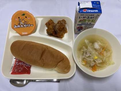 「かぼちゃのミートグラタン、スープ、みかんゼリー、いちごジャム、牛乳」です。