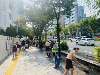 地域の皆様に見守られながら、安心・安全な学校生活を送ることができていることに感謝の気持ちを込めて、6年1組と5年2組の児童、そして保護者の皆様が「ふれあい清掃」に参加しました。この活動は、以前から堀川女性会の皆様が継続して取り組まれているもので、早朝から正門前の清掃を行いました。朝日を浴びながら取り組む清掃活動は、爽やかで気持ちのよい時間となりました。みんなで協力し合ったおかげで、正門周辺はとても綺麗になりました。地域の方々とふれあいながら活動することで、子どもたちも「自分たちの学校を大切にしたい」という気持ちを高めることができました。ご参加いただいた皆様、ありがとうございました。