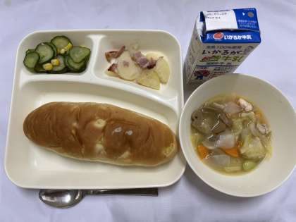 「鶏肉と野菜のスープ煮、ジャーマンポテト、きゅうりとコーンのサラダ、おさつパン、牛乳」です。
