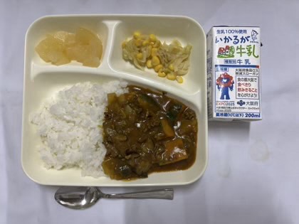 「夏野菜のカレーライス、サワーソテー、洋なし(缶)、牛乳」です。