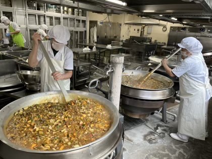 調理員さんが大きなかまで、カレーライスをつくってくれています。